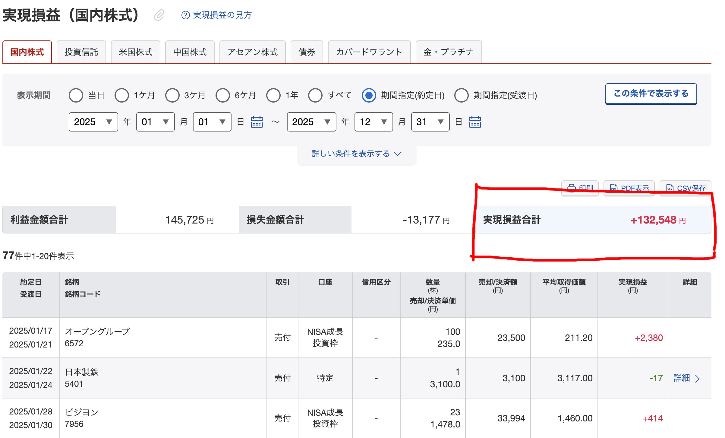 ただ、2025年は日経平均や、ダウ平均も上がった年なんですよね。なので、売買の手間や、勉強時間の不要なインデックス投資とどちらが良いかというとなかなか複雑です。今年はトランプショックの恩恵に預かることができただけで、普通にやっていたら圧倒的にインデックス投資の方が良い結果が出たと思いますので。